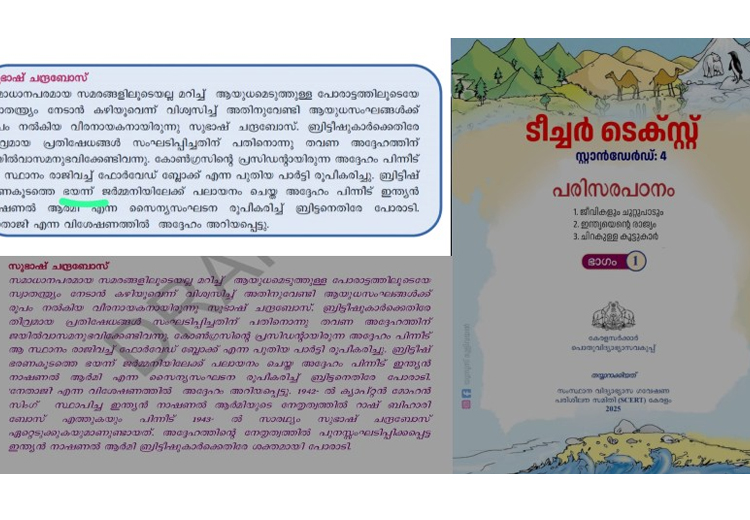 വിദ്യാര്ത്ഥികളെ പഠിപ്പിക്കാനായി അധ്യാപകര്ക്ക് നല്കുന്ന കൈപ്പുസ്തകത്തില് സുഭാഷ് ചന്ദ്രബോസിനെ കുറിച്ചുള്ള ഭാഗത്താണ് ഗുരുതര പിഴവ് വന്നിരിക്കുന്നത്. ബ്രിട്ടീഷ് ഭരണകൂടത്തെ ഭയന്ന് ജര്മനിയിലേക്ക് സുഭാഷ് ചന്ദ്രബോസ് പലായനം ചെയ്തെന്നാണ് തെറ്റായ പരാമര്ശം. ഇതാണ് വിവാദത്തിനിടയാക്കിയത്. സംഭവം ശ്രദ്ധയില്പെട്ട അധ്യാപകര് അറിയിച്ചതനുസരിച്ച് തെറ്റ് തിരുത്തി പുസ്തകം പുറത്തിറക്കിയതായി എസ്.സിഇആര്ടി അറിയിച്ചു. എന്നാല്, ഭയന്ന് എന്നതിന് പകരം പലായനം എന്നാക്കിയാണ് തിരുത്തിയിരിക്കുന്നത്. പിഴവ് എങ്ങനെ പുസ്തകത്തില് കയറിക്കൂടി എന്നത് സംബന്ധിച്ച് എസ്.സിഇആര്ടി അന്വേഷണം ആരംഭിച്ചിട്ടുണ്ട്.